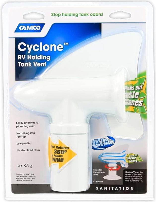 O Camco Cyclone 40595 é uma tampa de ventilação inteligente para o sistema de esgoto de trailers e motorhomes. Projetado para utilizar a força natural do vento e da movimentação do veículo, ele cria um efeito ciclone que suga e expulsa os gases para fora, evitando que o mau cheiro retorne para o interior do banheiro.